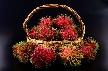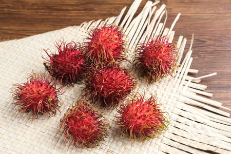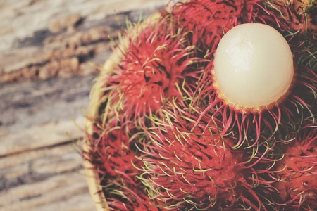 Ripe rambutan fruit in a bamboo basket on wooden background, Rambutan is tropical fruit and native Southeast Asia, juicy and sweet taste