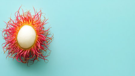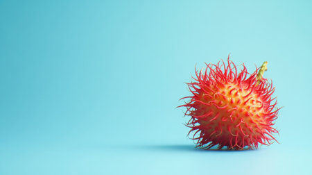 A vibrant rambutan fruit sits on a blue background, showcasing its unique spiky exterior. This image highlights the exotic appeal and vibrant colors of this tropical delight.