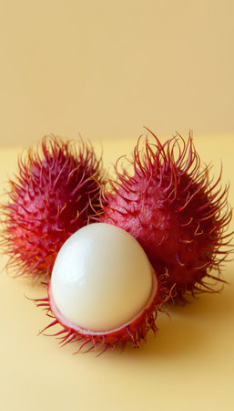 Three Vibrant Red Rambutan Fruits, One Open Revealing Juicy White Flesh, on Yellow Background.