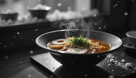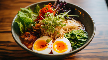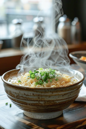 AI Generated. Steaming bowl of ramen with fresh vegetables and crispy toppings served in a cozy setting