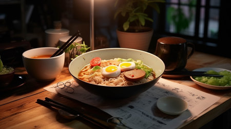 Realistic ramen soup with cozy atmosphere neutral colors warm lighting highly detailed in a restaurant setting with no visitors. Generative AI Generated