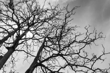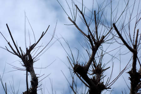 dried asymmetric sides of branches of a tree in winter with falling leaves