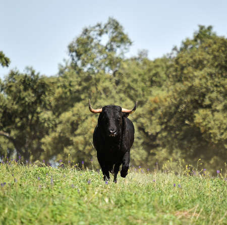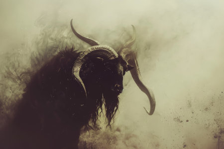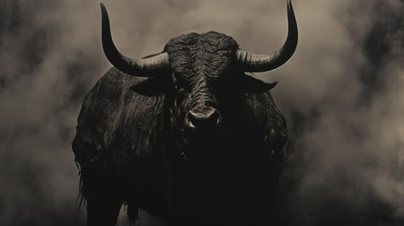A powerful bull stares directly at the viewer with intense eyes, surrounded by an aura of darkness. Its thick black fur and prominent horns create a striking silhouette full of strength.