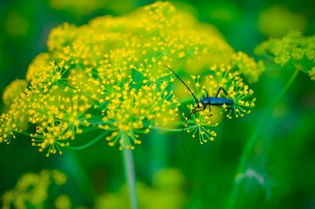 Black beetle Cerambyx cerdo sitting on a flower dill