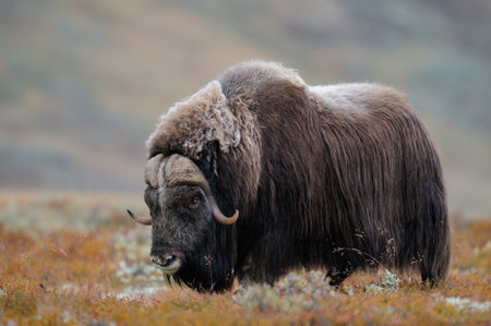 Musk ox bull is looking in an autumn landscape, dovrefjell, norway, (ovibos moschatus)
