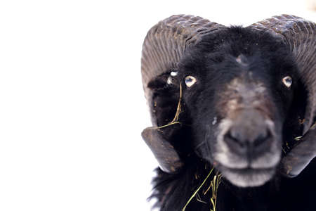 black ushant dwarf sheep in isolated portrait outdoors in winter with copy space for text - mindful intense mood for sustainable wool fashion concept