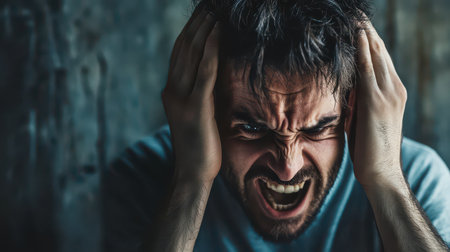 A man in a dim light shouts with his hands on his head revealing intense emotional distress and pain.