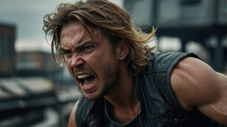 A man with long hair and beard is screaming, AI