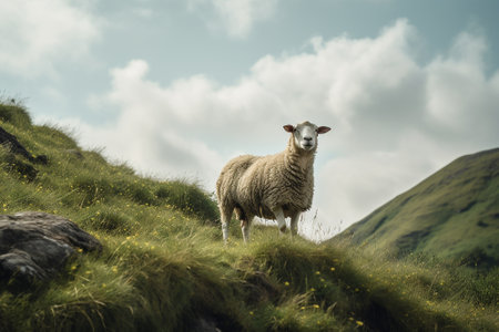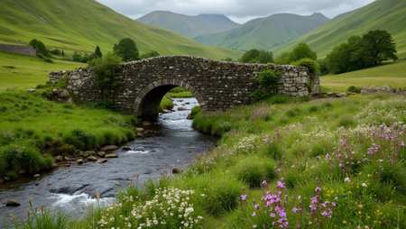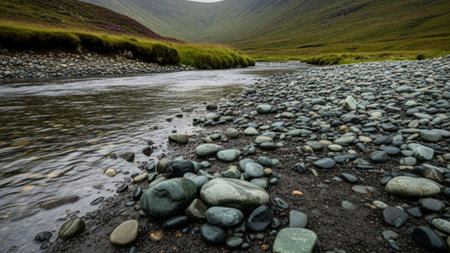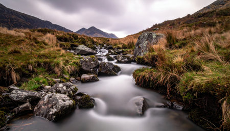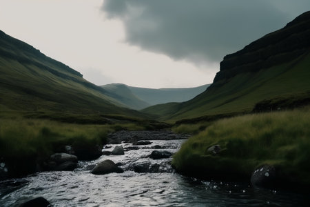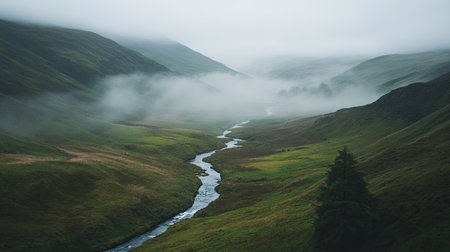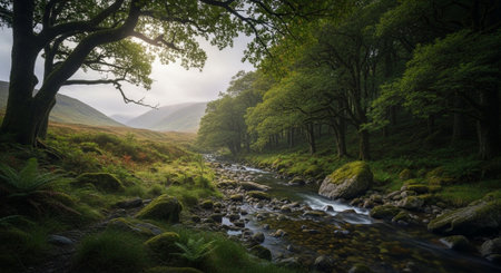 a stream flows from a majestic mountain in the valley, creating a picturesque scene reminiscent of traditional british landscapes. the photo captures the enchanting backlight and misty atmosphere, evoking a sense of tranquility and natural beauty. shot on 70mm, this national geographic-worthy image showcases pastoral settings at their finest. ai generated
