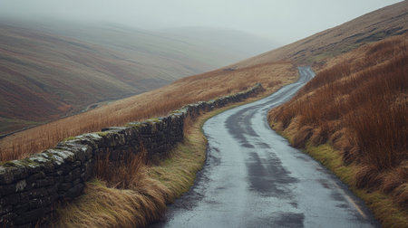 A scenic winding road meanders through misty hills, showcasing a serene landscape with a stone wall and tall grass. Perfect for nature enthusiasts.