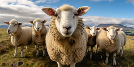 Sheep gazing at the camera amidst a flock, set against the backdrop of the sky.