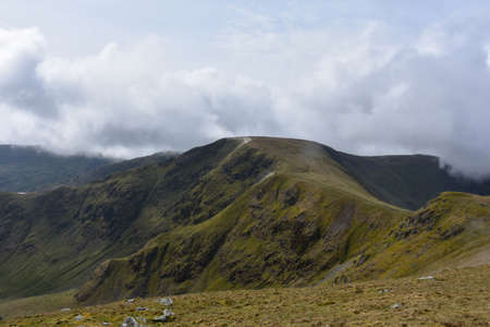 Beautiful views from the path on the way to Scafell pike, the highest mountain in England, Lake District National Park, England, selective focus