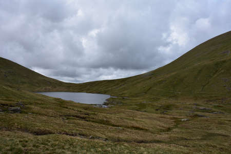 A view down grassy banks to Llyn Ffynnon y-gwas, a lake below the steep flanks of the west face of Snowdon, Wales, UK.