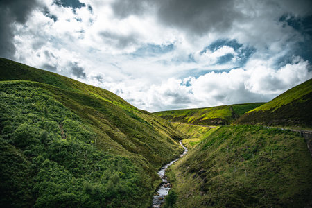 Little stream between two hills and a curvy road in Yorkshire, UK