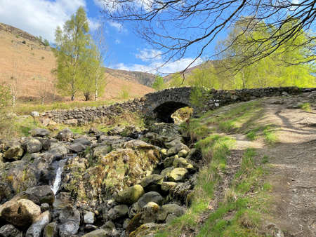 Honister Pass, a mountain pass with a narrow road winding along Gatesgarthdale Beck mountain stream. One of the steepest and highest passes in the region. Cumbria, the Lake District, England.