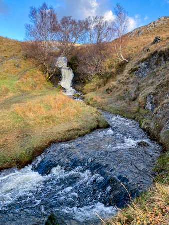 River Eiddew with Rhiwargor waterfall in the distance. Lake Vyrynwy, Powys, Wales UK, landscape, wide angle, Autumn