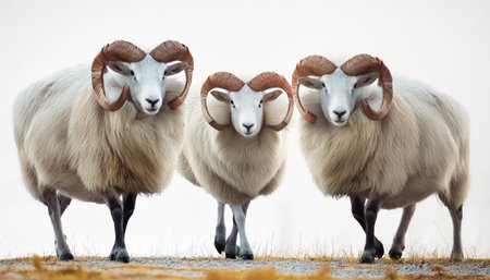 Portrait of a beautiful white ram with large horns and a herd of sheep or flock of sheep, on a mountain pasture looking at camera. Generative Ai.