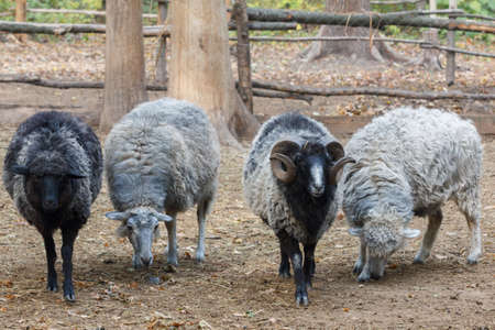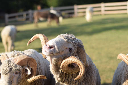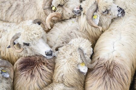 Sheepfold view from above or closeup. Cute portrait of male sheep looking at the camera. Hipster sheep bad ass fur animal for sale during country fair market.Beautiful animal shepherd's festival rural