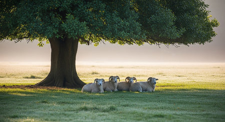 sheep standing in a field, resembling mythical creatures with distinct facial features. the immersive environment showcases tropical symbolism, while the sheep's strong facial expression captivates. the photo is captured using a c-mount lens, resulting in a dark beige and amber color palette. ai generated