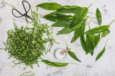 Fresh wild garlic or bear leek on the table, wild garlic dishes. Herbalis. Flat lay
