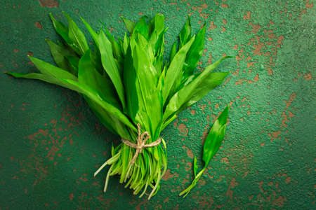 Bouquet of green leaves of wild garlic. Allium ursinum is rich in vitamins. Medicinal plant for the prevention of diseases and increase immunity. Super food.