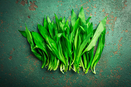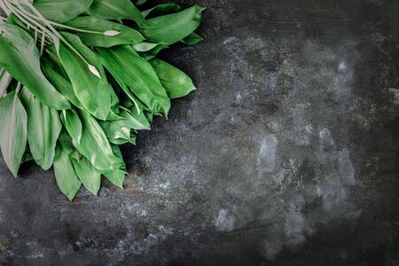 A bunch of fresh wild garlic leaves on dark background. Wild leek. Top view. Free space for your text.