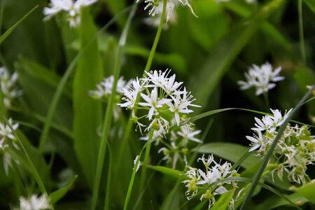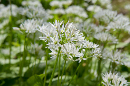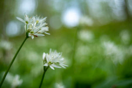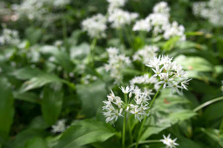 Flowering ramson, Allium ursinum. Blooming wild garlic plants in the woodland in spring - selective focus