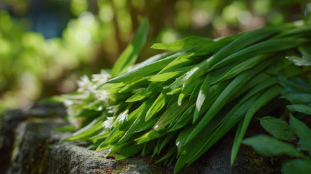 Freshly Picked Wild Garlic with Delicate Blossoms on a Mossy Stone