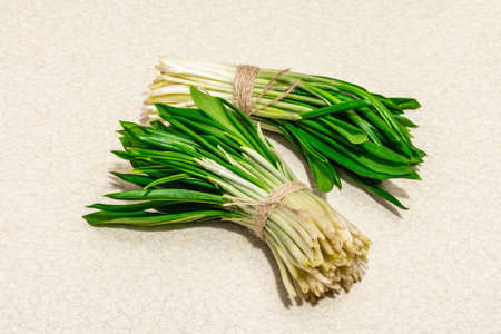 Freshly rinsed wild ramps or wild onion on the table. Allium ursinum.