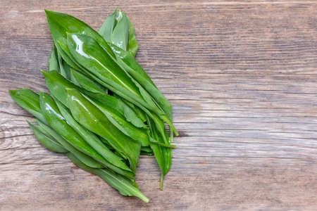 fresh washed leaves of wild garlic on a wooden vintage background with copy space. top view close-up
