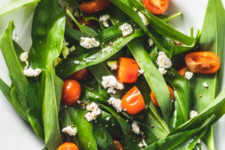 Fresh salad with wild garlic,tomatoes and feta cheese on plate. Ramsons leaves.