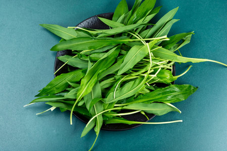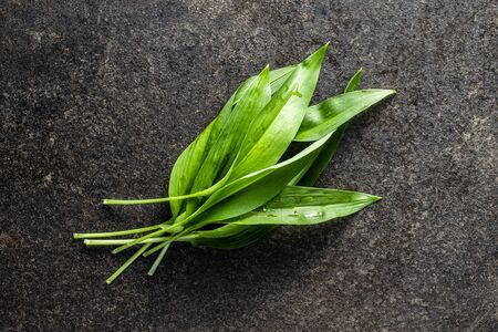 Green wild garlic leaves. Ramsons leaves on black table.