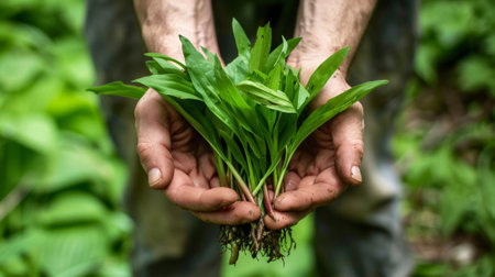 A pair of hands holding a bunch of wild ramps recently dug up from the forest floor