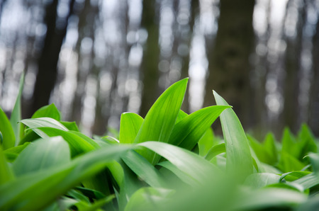 Spring medical nutritional plant and fresh, natural, wild-grown, bears garlic leaves in forest