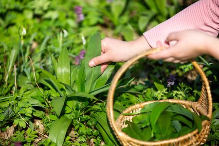 Picking fresh wild garlic leaves in nature. Hands holding basket of ramson wild garlic leaves