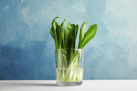 Glass of wild garlic or ramson on table against color background
