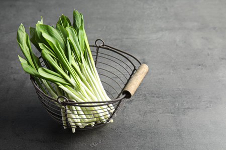 Basket with wild garlic or ramson on gray table. Space for text