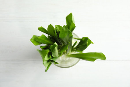 Glass of wild garlic or ramson on white wooden table, top view