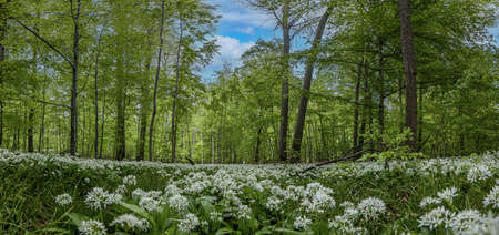 View over a piece of forest with dense growth of white flowering wild garlic in spring during daytime