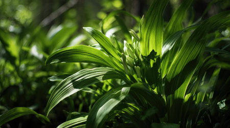 Generative AI : A green forest in springtime with bears garlic flowers blooming