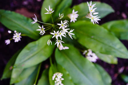 Medicinal herbs plants. Close up of blooming wild garlic. Allium ursinum in forest or garden in spring.