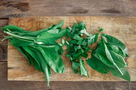 Fresh green ramsons leaves with cut leaves on a wooden background. Top view