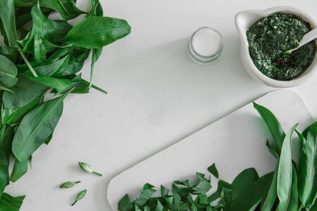 Fresh green wild garlic with pesto on a white table, top view