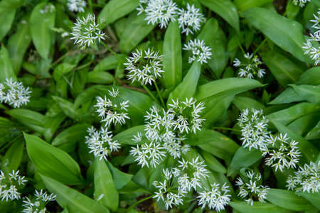 Medicinal plant Bear's garlic - Allium ursinum. Garlic has green leaves and white flowers.