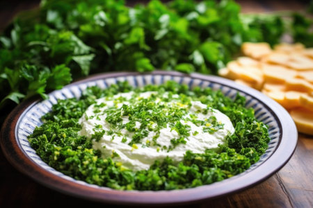 sprinkling chopped parsley over a plate of taramasalata, created with generative ai