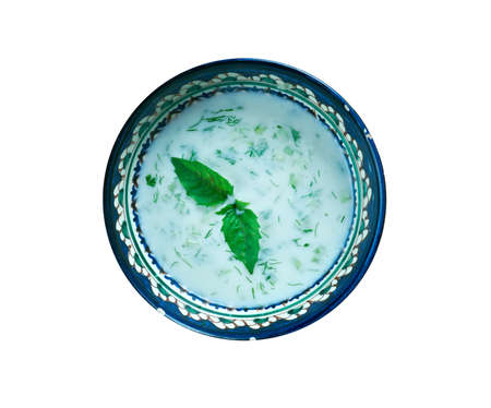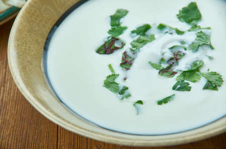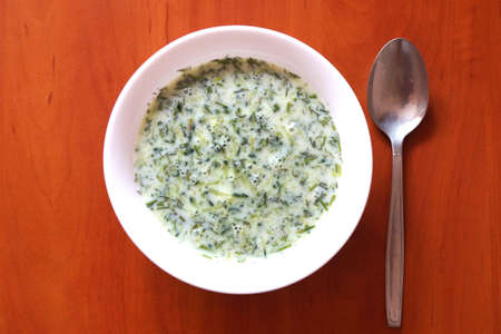 cucumber sour milk soup on a wooden table, top view