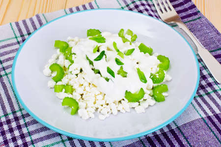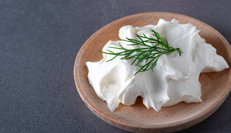 Cottage cheese with cream for breakfast from above space for text