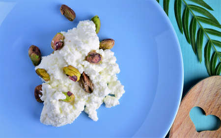 Pistachios on fresh cheese, served on a blue porcelain plate.
