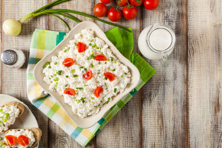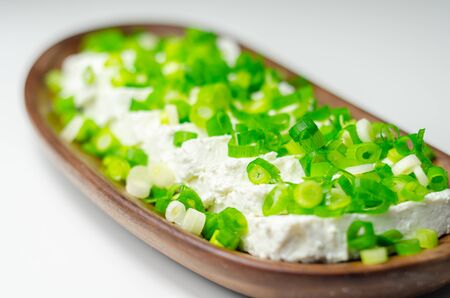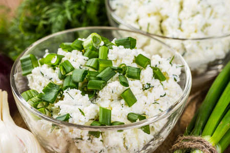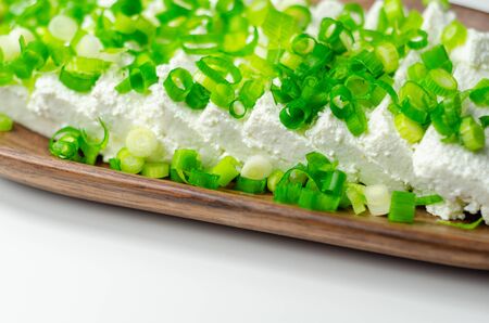 Cottage cheese with chives and spring onions on a wooden tray, fresh and healthy breakfast