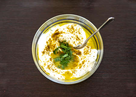 Delicious curd with herbs in a cup.